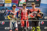 "Sull'acqua non è mai facile, l'importante è non fare errori - ha spiegato il pilota pugliese - anche perché con questa moto non avevamo mai girato sul bagnato. In Ducati abbiamo fatto proprio un bel lavoro". Dietro a Pirro si sono piazzate la Yamaha di Alex Bassani e la Ducati di Riccardo Russo. In Moto3, sempre sotto una pioggia battente, Nicholas Spinelli (Honda) ha vinto per distacco una gara ricca di colpi di scena e di cadute. Dietro al pilota teramano si sono piazzati nell'ordine il leader della classifica e campione in carica Kevin Zannoni (Tm) e Nicola Carraro (Tm).