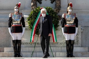 Il capo dello Stato Sergio Mattarella si è recato all'Altare della Patria per deporre una corona di alloro in occasione del 2 giugno. Con indosso l'ormai inseparabile mascherina, il presidente della Repubblica ha ascoltato l'esecuzione dell'Inno d'Italia, poi accompagnato dai presidenti delle Camere Elisabetta Casellati e Roberto Fico, dal premier Giuseppe Conte e dalla presidente della Corte costituzionale Marta Cartabia, ha salito lo scalone dell'Altare della Patria ed ha deposto la corona di fiori al sacello del Milite ignoto. Ad attenderlo ai lati del monumento, i vertici militari e una rappresentanza delle professioni sanitarie che hanno combattuto in prima persona l'epidemia di coronavirus. Al suo arrivo Mattarella è stato accolto in piazza Venezia dagli applausi della gente in attesa della cerimonia.