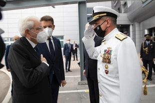 Con Mattarella il vicesegretario Nato Mircea Geoana, il ministro della Difesa Lorenzo Guerini, l'ammiraglio Robert Burke comandante del Comando interforze alleato di Napoli e comandante delle Forze navali Usa in Europa e in Africa.