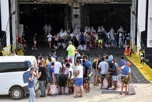 L'"Azzurra", del gruppo Grandi navi veloci, era partita ieri sera da Porto Empedocle per il trasbordo dei migranti dell'hotspot dell'isola, per la quarantena. Da contrada Imbriacola - al collasso, visto che ieri si contavano oltre 1.000 persone dopo gli ultimi sbarchi - sono giunti i primi migranti, già saliti sulla nave che rimarrà in rada di fronte le Pelagie. Altri, muniti di mascherine, saliranno nelle prossime ore. A dirigere le operazioni personale sanitario e della Croce Rossa, che indossano le tute bianche anti Covid.