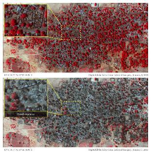 Amnesty ha anche diffuso immagini satellitari di Baga e Doron Baga, a circa 2,5 chilometri di distanza, che mostrano l'ampiezza della distruzione: le immagini sono state scattate a cinque giorni di distanza, il giorno prima dell'attacco e quattro giorni dopo, e mostrano che molte case e villaggi sono stati letteralmente rase al suolo. "Queste dettagliate immagini mostrano una devastazione di proporzioni catastrofiche in due città, una delle quali è stata quasi cancellata dalla carta geografica nello spazio di quattro giorni - ha dichiarato Daniel Eyre, ricercatore di Amnesty sulla Nigeria - di tutti gli attacchi di Boko Haram presi in esame da Amnesty International, questo è il più grande e il più distruttivo di sempre, un deliberato attacco contro la popolazione civile le cui case, le cui scuole e i cui ambulatori sanitari sono ormai solo rovine fumanti".