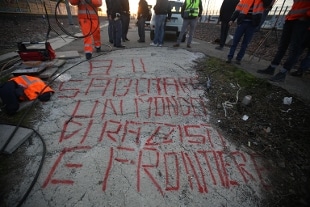 A poche ore dall'arrivo di Salvini per la manifestazione in programma oggi, dati alle fiamme in quattro punti diversi dei cavi elettrici interrati. Una scritta a terra punta il dito contro "un mondo di razzisti e frontiere"