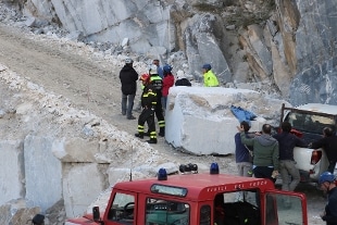 L'allarme al 118 e' arrivato ieri alle 13,48 quando il monte si e' sbriciolato con un grande boato. Sul posto sono arrivati subito i soccorsi e l'elicottero con il quale e' stato tratto in salvo l'operaio, con l'imbracatura, che era rimasto sospeso in aria. Il suo compito sarebbe stato quello di rimuovere i detriti dal tetto della cava. Per lui, 48 anni, residente in una frazione di Massa, la corsa in ospedale e il ricovero, se la cavera' in 30 giorni. Secondo una prima ricostruzione, sembrava che gli operai fossero precipitati nel vuoto per una trentina di metri e con loro anche una macchina tagliatrice. Si e' poi appreso, invece, che i due, di 55 e 46 anni, abitanti come il loro collega nella zona di Massa, sarebbero stati sepolti dalla frana mentre stavano lavorando sotto la cima della cava dove si stava mettendo in sicurezza la parete del taglio del marmo.