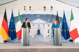 Sostegno al Recovery fund per una risposta tempestiva e solidale all'emergenza Covid. Vedute comuni tra la cancelliera tedesca Merkel e il premier italiano Conte, in vista del Consiglio europeo. Il bilaterale oggi nel castello di Meseberg, alle porte di Berlino.