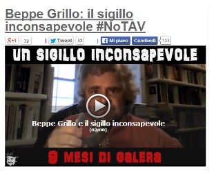 In quello che definisce come "un appello di solidarietà alla Val di Susa", Grillo osserva: "Sono più di 500 inquisiti, tutti sotto processo per delle cose che io non riesco assolutamente a capire. Voglio dare la mia solidarietà a Alberto Perino e a tutti i ragazzi della Val di Susa che devono risarcire un danno ipotetico di 215.000 euro, ne hanno già raccolto circa 100.000 e ne mancano altrettanti. C'è poco tempo e dobbiamo dargli una mano a risolvere questo problema. La TAV è un problema che non riguarda solo la Val di Susa, ma tutta l'Italia e forse tutta l'Europa, ma noi siamo