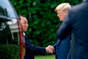 Strette di mano e foto ufficiali nel giardino della Casa Bianca al termine dell'incontro nello studio Ovale fra il presidente Usa e il vicepresidente del Comitato centrale del Partito dei Lavoratori, il generale Kim Yong Chol, giunto a Wshington con una missiva da parte di Kim Jong-un