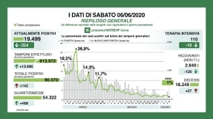 Dall'inizio dell'epidemia sono in tutto 90.070 i contagiati. Sono 110 le persone al momento ricoverate in terapia intensiva,dieci meno di ieri, e 2840 quelle negli altri reparti (-120). I decessi registrati sono 27, in totale 16.249.