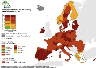 Nella nuova mappa sono in zona rosso scuro anche vaste aree del Portogallo, della Spagna, dell'Irlanda, della Repubblica Ceca, dei Paesi baltici e alcune zone dei paesi scandinavi, della Germania e della Francia.