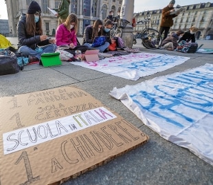 Nel giorno in cui 260 comuni del Piemonte entrano in dad al 100% per contenere la diffusione dei contagi da Covid 19, gli studenti torinesi sono tornati in piazza a Torino per protestare contro la didattica a distanza che sotto la Mole coinvolge le scuole dalla seconda media in su. Muniti di computer, qualcuno anche thermos di caffè e coperte, sono seduti in piazza Castello davanti alla sede della Giunta regionale. Tra le prime ad arrivare Anita, la 12enne simbolo della protesta contro la dad. "Meglio un lockdown totale che la chiusura della sola scuola. Avrebbe più senso", sottolinea la studentessa insieme alle compagne con la quali condivide da sempre la protesta. "Continuiamo a chiedere i dati che dimostrino che noi studenti siamo veicolo di contagio e che per questo chiudono le scuole ma non ci dimostrano il perché. Ecco perché siamo nuovamente qui". In piazza anche i genitori che non nascondono il disappunto considerando l'esclusione dalla didattica in presenza i figli dei lavoratori essenziali.