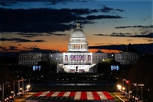 Solo mille ospiti (con mascherine e distanziamento sociale), in gran parte scelte dai membri del Congresso, contro gli almeno 200 mila invitati tradizionalmente dai parlamentari: a evocare questa folla di assenti altrettante bandiere americane allineate sul Mall e illuminate da 56 colonne di luce, il numero degli Stati e dei territori americani. Presenti tutti gli ex presidenti (a parte Trump e Carter).