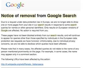 La Wikimedia Foundation critica la sentenza della Corte di Giustizia Europea e pubblica le notifiche ricevute dal motore di ricerca. Tra le pagine che in Europa non appaiono nei risultati ci sono anche quelle su Renato Vallanzasca e sulla Banda della Comasina