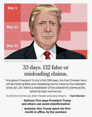 Il quotidiano promette costanti aggiornamenti nel corso dei primi 100 giorni alla Casa Bianca del miliardario che accusa i media di produrre fake-news contro di lui e che regolarmente mente, o quasi, rifila falsità o quasi via Twitter o nei suoi discorsi.