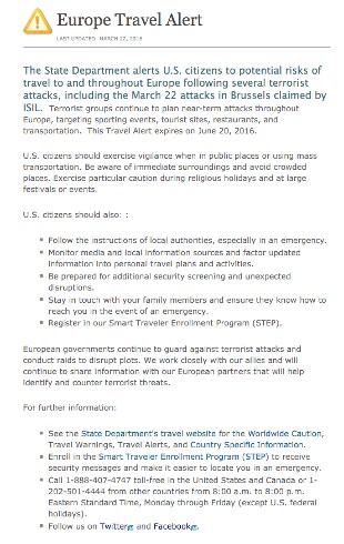 U.S. citizens alerted to potential risks of travel to and throughout Europe following #BrusselsAttacks. Details: https://t.co/G3AYMsK503