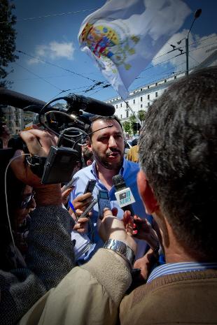 "Siamo qui per un problema più serio dei cori da stadio che è il lavoro, siamo qui per cancellare la legge Fornero e, quindi, restituire lavoro e pensioni che una legge infame ha rubato agli italiani. Siamo qui per cancellare l'euro che è un problema per Milano quanto per Napoli e per fermare l'immigrazione clandestina", ha affermato Salvini rispondendo alle domande dei cronisti, e ha continuato "Quanti voti prenderò? La battaglia contro l'euro non la faccio per i voti ma per mio figlio e per la disoccupazione. Il voto è l'ultimo dei problemi".