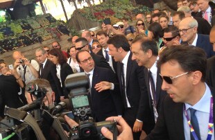 Dopo una brevissima cerimonia di inaugurazione per la Giornata nazionale della Francia, Renzi e Hollande raggiungono il padiglione francese passeggiando per il Decumano, il viale su cui sorgono i padiglioni dei Paesi stranieri. Imponente lo schieramento di sicurezza a loro protezione.