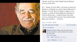 — Shakira (@shakira) 17 Aprile 2014Pochi minuti dopo la notizia della morte, sulla pagina Facebook di Gabriel Garcia Marquez, che conta oltre 4 milioni di fan, gestita dal suo editore americano, è comparso questo epitafio: "El realismo mágico en las novelas y cuentos de Garcia Márquez impactaron a millones de lectores, y resaltó la pasión de Latino America. Considerado el escritor más popular desde Miguel de Cervantes del siglo 17, Garcia Márquez alcanzó la celebridad literaria que se comparan a Mark Twain y Charles Dickens. Su novela Cien años de soledad vendió más de 50 millones de copias en 25 idiomas".