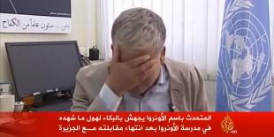 Non riesce a trattenersi e piange il portavoce della Nazioni Unite a Gaza Chris Gunness, intervistato da Al Jazeera, in merito ai bombardamenti della scuola Onu in cui sono rimaste uccise 15 persone e ci sono stati almeno 90 feriti