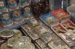 Le Fiamme gialle hanno sequestrato sia i gadget preferiti dai turisti, come calamite, portachiavi e posaceneri, sia prodotti destinati ai pellegrini, come le immagini sacre ed i rosari.