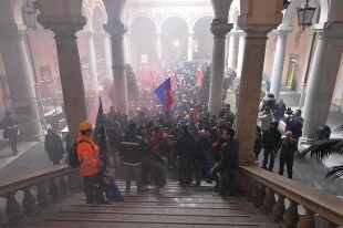 L'occupazione era iniziata questa mattina in cortile. Il corteo, aperto dallo striscione 'Pacta sunt servanda', che inizialmente doveva recarsi in Prefettura, ha fatto una improvvisa deviazione e i lavoratori sono entrati in Municipio. La Fiom ha annunciato che continuerà l'occupazione di Palazzo Tursi finché il prefetto di Genova "non ci darà una data precisa per l'incontro con il governo", ha detto il segretario generale Genova Bruno Manganaro.