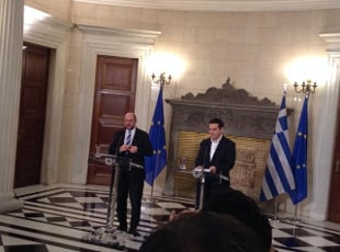 Il premier greco, Alexis Tsipras, che ha definito il colloquio ""utile e costruttivo", durante la conferenza stampa ha chiesto "tempo" per realizzare le "riforme più ampie" su cui si è impegnato il suo governo. "La Grecia - ha sottolineato Tsipras - ha un progetto di produttività costruttiva e di grandi riforme e non vuole insistere nell'errore dell'austerità". Poi ha aggiunto: "Per quattro anni il popolo greco ha vissuto quotidianamente il fallimento del programma della svalutazione interna. In sostanza pagava per gli errori degli altri". Ha poi assicurato: "Vogliamo trattare di sicurezza e stabilità. Coloro che puntano al contrario possono star certi che molto presto saranno smentiti". L'Europa, ha concluso il premier, "supererà la crisi e sarà più forte di prima".