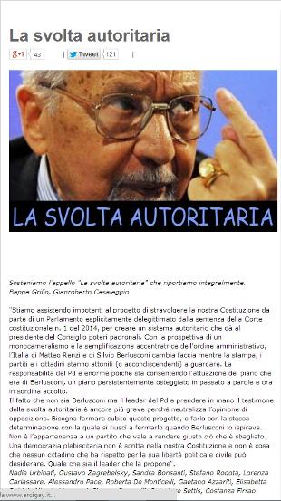 "Stiamo assistendo impotenti al progetto di stravolgere la nostra Costituzione da parte di un Parlamento esplicitamente delegittimato", dice l'appello ripreso sul blog.