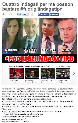 Così Beppe Grillo chiede anche le dimissioni di Francesca Barracciu, Umberto Del Basso de Caro, Vito De Filippo e Filippo Bubbico, di cui ricorda la posizione: “Francesca Barracciu, accusata di peculato nell'inchiesta sui rimborsi spese ai consiglieri regionali in Sardegna; Umberto Del Basso de Caro, indagato per i rimborsi del consiglio regionale in Campania; Vito De Filippo, indagato nell'ambito della 'Rimborsopoli' lucana e Filippo Bubbico, indagato per abuso d'ufficio”