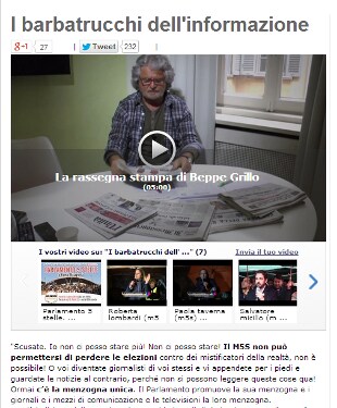 "Io voglio - conclude Grillo - che voi vi ribelliate! Prenderemo delle contromisure, prendiamo dei pullman, un camper, ci mettiamo sopra il tetto con un amplificatore della Madonna, veniamo lì e spargiamo un po' di seme di realtà. Vi ho dimostrato in tutti questi anni di non avere mai mentito, non vogliamo fare coalizioni e non le abbiamo fatte, a casa tutti e ce li manderemo. Ora andiamo in Europa per cambiare l'Italia da là. Noi andiamo lì a togliere il Fiscal Compact, a togliere il Mes, a togliere il pareggio in abito in costituzione. Se non andrà bene allora parleremo di debito, di spalmare il debito, eurobond, e faremo un referendum sull'Euro! E se usciremo lo avrà decretato il popolo italiano! I giornali sono spazzatura! Per piacere: siate curiosi, guardate che cosa c'è dietro la notizia, per favore, perché tutte le cose che sapete sono false e la verità è quello che non sapete!".