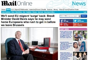 L'uomo che dovra' guidare i negoziati tra Londra e Bruxelles ha negato che il governo voglia mandar via i 3 milioni di migranti europei, soprattutto polacchi e romeni, che sono gia' nel regno ma ha manifestato la ferma intenzione di intervenire qualora i nuovi afflussi diventassero troppo massicci.
