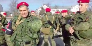 Si distinguono le fasce nere al braccio con il simbolo della Polizia Militare delle Forze Armate russe. Uno dei compiti assegnati alla polizia militare russa è la protezione dei siti sensibili d’importanza strategica del Ministero della Difesa russo.