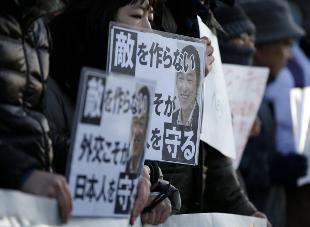 Alcune centinaia di persone hanno manifestato nel pomeriggio a Tokyo davanti all'Ufficio del primo ministro contro Abe e le sue politiche sul ruolo proattivo di Tokyo verso i conflitti internazionali che, come dimostra il caso dei due ostaggi, accusano, comporta rischi. "Colpa tua Abe", si leggeva su un cartello, mentre su un altro ben più grande, c'era la dedica al reporter: "Kenji, sarai vivo nelle nostre memorie". Anche i 200 milioni di dollari di aiuti umanitari promessi poche settimane fa ai Paesi alle prese con lo Stato islamico sono finiti sotto accusa.