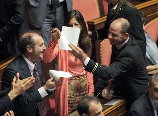 La tensione è salita quando il Ministro presenta il maxi-emendamento: interruzioni, proteste, lanci di monetini e fogli bianchi alzati nei banchi M5S tanto che il Presidente Grasso sospende la seduta e viene espulso il capogruppo Petrocelli. "Sono stato espulso per aver mostrato in Aula un foglio bianco - ha protestato l’esponente 5 Stelle -. Il foglio rappresenta la delega in bianco che il governo vuole farci firmare con la fiducia sul Jobs Act. Per la prima volta un capogruppo viene espulso dal Senato per aver mostrato un cartello perfettamente bianco, rasentiamo l’assurdo». Petrocelli si è rifiutato di lasciare l’emiciclo e i senatori 5 Stelle gli hanno fatto scudo intorno, rifiutandosi di abbandonare l'emiciclo.