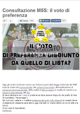Ottavo punto che passa dal voto degli attivisti sul sito: si deve decidere se il voto di preferenza deve essere disgiunto da quello di lista. A Montecitorio il M5S annuncia l'appoggio a votare l'emendamento La Russa per le preferenze