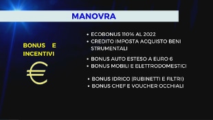 Dalla proroga del Superbonus a tutto il 2022, oggetto di discussione nella maggioranza, agli incentivi per le auto, dalle assunzioni di 3 mila medici e 12 mila infermieri per attuare la campagna vaccinale anti-Covid alla Cassa integrazione guadagni e lo stop dei contributi per gli autonomi. E ancora nella manovra da 40 miliardi ci sono bonus per sostituire docce e rubinetti o per installare depuratori di acqua potabile, credito d'imposta per gli chef fino al voucher per gli occhiali da vista, congedi neopapà e assegni per genitori soli con figli disabili