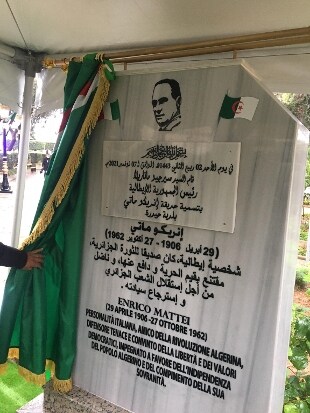 Sulla targa, in alto l'immagine incisa del volto di Mattei, circondato dalla bandiera algerina e quella italiana. In basso la seguente scritta in arabo e con la traduzione in italiano: "Personalità italiana - si legge nell'epigrafe - amico della rivoluzione algerina, difensore tenace e convinto della libertà e dei valori democratici, impegnato a favore dell'indipendenza del popolo algerino e del compimento della sua sovranità".