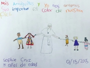 Nella lettera, Sophie scrive: "Io e i miei amici ci vogliamo bene, senza porre importanza al colore della nostra pelle. Firmato Sophie Cruz". Il messaggio contiene un disegno della piccola raffigurante il papa che tiene la mano a bambini di razze diverse.