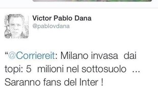 Un tweet e il derby Milan-Inter si infiamma. Dopo quello sul mercato, vinto dall'Inter con l'acquisto di Kondogbia inseguito anche dal Milan, sui social è un collaboratore Mr Bee, nuovo socio di Berlusconi, a scatenare la polemica. Sul profilo di Victor Pablo Dana parte un cinguettio di commento a un articolo pubblicato dall'edizione Milano del Corriere della Sera. Dana scrive: "Milano invasa dai topi: 5 milioni nel sottosuolo... Saranno fans dell'Inter".