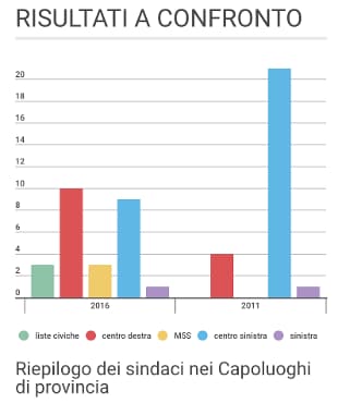Complessivamente le comunali 2016 nei comuni capoluogo di provincia assegnano 10 sindaci al centrodestra; 9 sindaci al centrosinistra; 3 sindaci al Movimento 5 Stelle; 3 sindaci alle liste civiche; 1 sindaco alla sinistra. Nelle precedenti elezioni il centrosinistra ebbe 21 sindaci; il centrodestra 4; la sinistra 1; il movimento 5 Stelle nessuno.