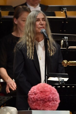 A esibirsi alla cerimonia a Stoccolma è stata Patti Smith, che si è commossa mentre cantava 'A Hard Rain's a-Gonna Fall', "una delle canzoni più belle" di Bob Dylan, e si è dovuta interrompere. Su Facebook, Patti Smith ha detto di avere "un grande debito" con Dylan per l'influenza che ha avuto su di lei e si è dichiarata "molto orgogliosa" di interpretare un brano del folksinger.