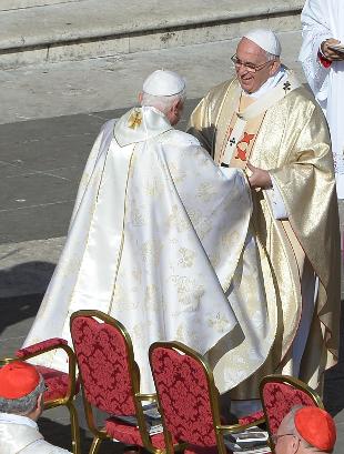 Il Papa emerito Benedetto XVI ha concelebrato con Francesco la messa di beatificazione di Giovanni Battista Montini. Migliaia i fedeli in piazza