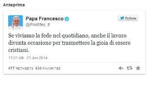 Anche Papa Francesco interviene sul lavoro: "Se viviamo la fede nel quotidiano, anche il lavoro diventa occasione per trasmettere la gioia di essere cristiani". Lo dice sul suo account Twitter.