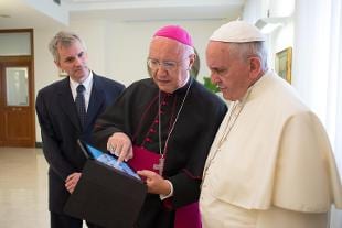 Papa Francesco con il tablet accende l'albero di Natale più grande del mondo