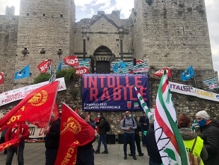 Sul Castello dell'Imperatore, che domina piazza Santa Maria delle Carceri, sede del presidio, svetta uno striscione con la scritta 'Morire di lavoro oggi non solo è inconcepibile, è intollerabile'. Sul palco i tre segretari provinciali dei sindacati confederali che hanno promosso la manifestazione e sei lavoratori iscritti alle sigle, alcuni dei quali provenienti dal settore tessile. Al presidio anche i lavoratori in sciopero della Texprint, dipendenti pakistani in protesta da mesi, iscritti al Si Cobas.