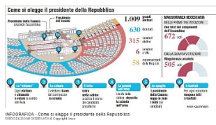 Il Capo dello Stato viene eletto a Montecitorio dal Parlamento riunito in seduta comune. Sono 1009 i "grandi elettori": 630 deputati, 321 senatori e i 58 delegati regionali. Per le prime tre votazioni la maggioranza richiesta è quella dei due terzi poi basta la maggioranza assoluta