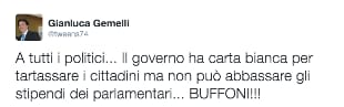 Prima dello scandalo Gemelli era molto attivo sui social nel denunciare i guasti della politica e nell'attaccare la "casta" per le sue responsabilità nell'amministrazione della cosa pubblica. Nel dicembre 2011 twittò per esempio contro la scelta di tassare i cittadini senza abbassare l'indennità dei parlamentari: