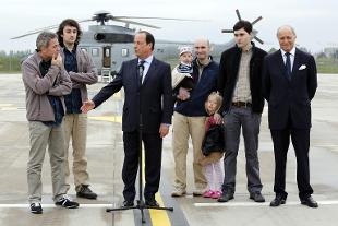 "La Francia è orgogliosa di avere cittadini di questo livello che servono in nome della libertà di stampa ed è orgogliosa di avere ottenuto la loro libertà" con queste parole il presidente francese Hollande ha accolto all'aeroporto di Villacoublay i quattro giornalisti rapiti in Siria