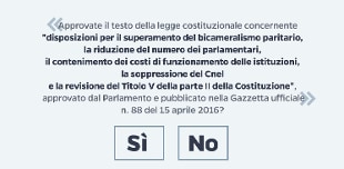 Si vota barrando la casella del Sì oppure quella del No. Una formulazione che ha sollevato le dure critiche delle opposizioni, che hanno accusato il governo di dare un'indicazione precisa agli elettori a favore del Sì. Eppure, il quesito risponde alle prescrizioni di legge. E precisamente, a determinare come deve essere sviluppato il quesito è la legge 352 del 1970, "norme sui referendum previsti dalla Costituzione e sulla iniziativa legislativa del popolo", che all'articolo 16 stabilisce: il quesito sulla scheda deve riprendere il titolo della riforma, così come pubblicato in Gazzetta Ufficiale.