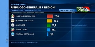Secondo i dati relativi al riepilogo nazionale dei voti di lista nelle elezioni regionali il terzo partito è Lega Nord, quarto posto Forza Italia