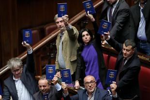 Critiche piovono anche dai Cinquestelle che abbandonano l'aula durante il voto. "È davvero doloroso per me essere qui oggi ma lo faccio con l'orgoglio di chi ha il compito di testimoniare la contrarietà al tentativo di rovinare la Costituzione imposto con metodi fascisti" ha detto in Aula il deputato M5S Danilo Toninelli durante le dichiarazioni di voto.