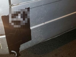 Portellone 'aggiustato' con il nastro adesivo di una nota marca automobilistica. "Qualche mese fa per l'apertura di questo portellone una donna in motorino ha rischiato l'amputazione di un braccio" denuncia l'autista