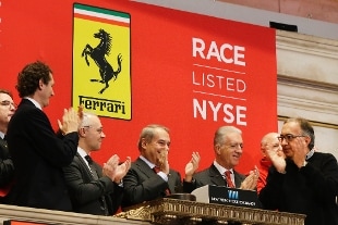 John Elkann, Sergio Marchionne e Piero Ferrari non nascondono l'emozione e la soddisfazione per una giornata storica, che vede parcheggiate una decina di 'Rosse' fuori dal New York Stock Exchange e cappellini e giacche rosse circolare sul floor. Con il simbolo 'Race' e il suono del 'rombo' del motore della Formula 1 che aleggia fuori da Wall Street, Ferrari raccoglie piu' di 900 milioni di dollari vendendo 18,8 milioni di azioni a 52 dollari l'una, per una valutazione da 10 miliardi di dollari. A 60 dollari per azione, il picco di giornata, Ferrari vale 11,3 miliardi di dollari.
